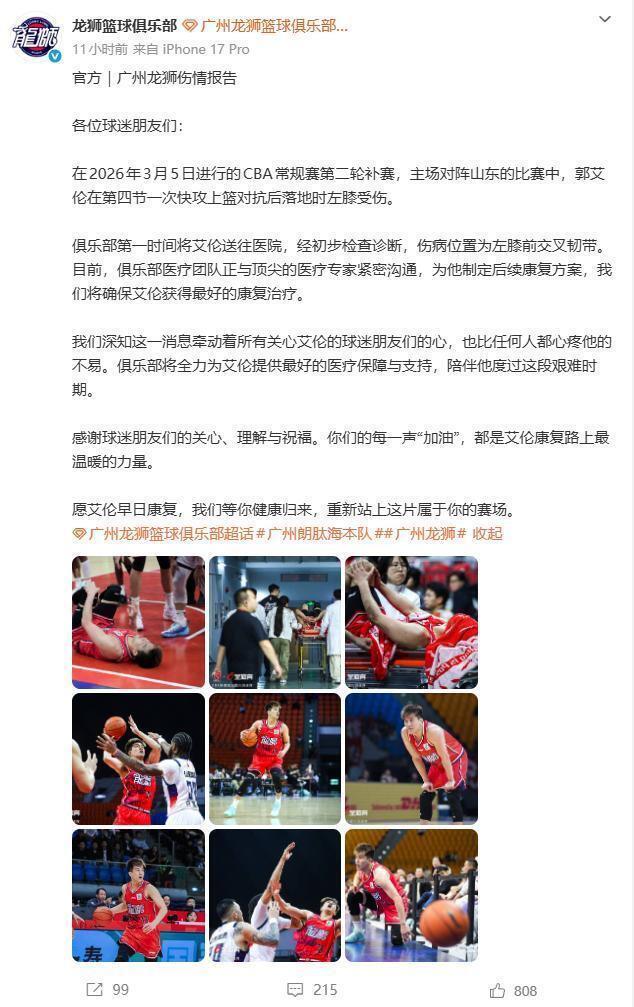很快,广州龙狮俱乐部正式官宣了郭艾伦的伤情,明确表示将承担他的全部治疗费用。官宣中提到,俱乐部医疗团队正与顶尖医疗专家紧密沟通,全力为郭艾伦制定科学完善的后续康复方案,确保他能获得最好的康复治疗,同时表达了对郭艾伦的心疼与支持,承诺将全程陪伴他度过这段艰难时期,期盼他早日康复、重返赛场。