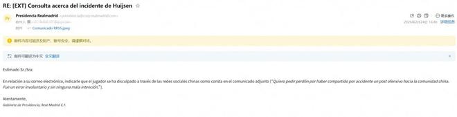 国内球迷通过邮件的方式致信了皇马,希望得到官方的回复和解释,对方给出的回复仍是“球员已通过中国社交媒体道歉”。关于赫伊森是否真的如同道歉内容所说的“不慎操作”以及“无心之举”,此前已经有多家媒体和球迷进行了分析,以他发文的社交媒体转发的要求,不可能出现两次误触操作,也不可能点赞评论,更不可能一条动态出现了超过3周的时间还没有发现,所以赫伊森辱华的证据没有丝毫问题。
