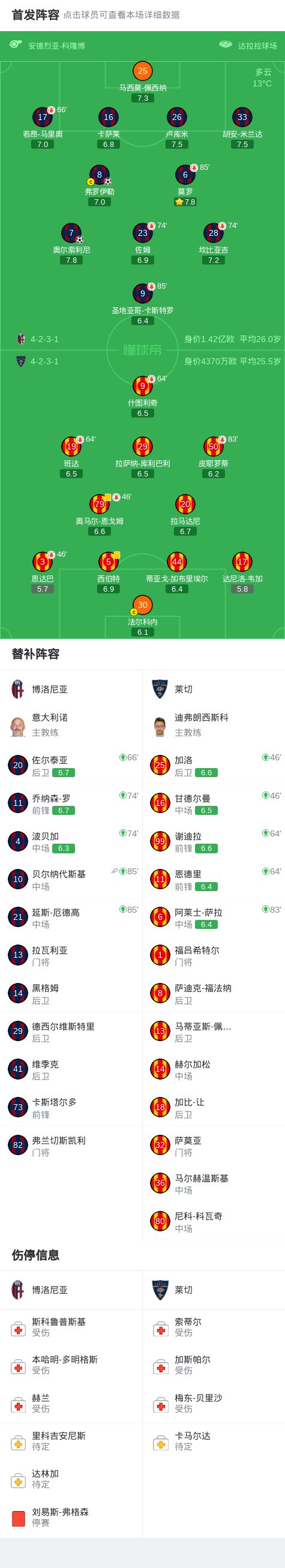 北京时间4月13日意大利足球顶级联赛第32轮,博洛尼亚主场对阵莱切。比赛中,弗罗伊勒为博洛尼亚率先取得进球,随后贝尔纳代斯基助攻奥尔索利尼再下一城。最终博洛尼亚以2-0战胜莱切。