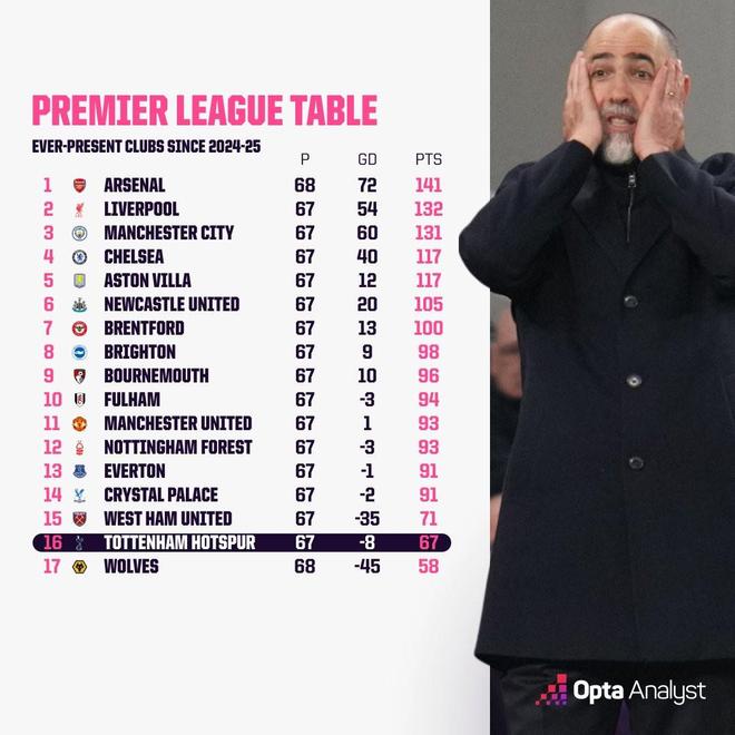北京时间3月6日,英超联赛第29轮,热刺在主场1-3不敌水晶宫。本赛季迄今为止,热刺29场比赛7胜8平14负积29分,暂列英超积分榜第16位。据知名数据平台Opta统计,自2024/25赛季以来,在17支始终参加英超联赛的球队中,只有狼队的总积分比热刺低。